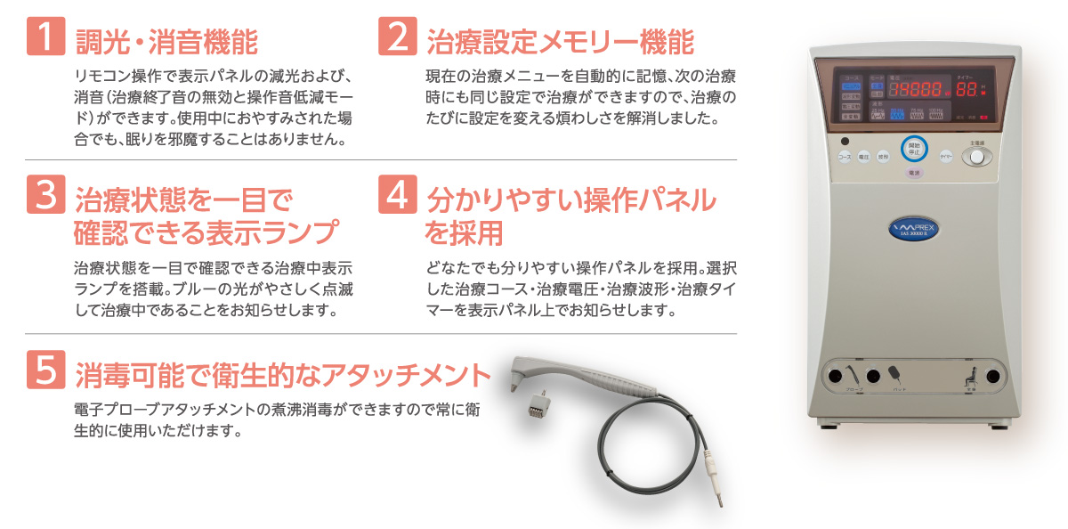 1400Vp出力で、ゆっくりおやすみになりながら4時間・6時間・8時間の長時間治療が可能です。高圧出力で治療を開始しても、60分後には自動的に1400Vp出