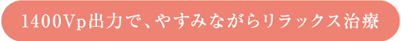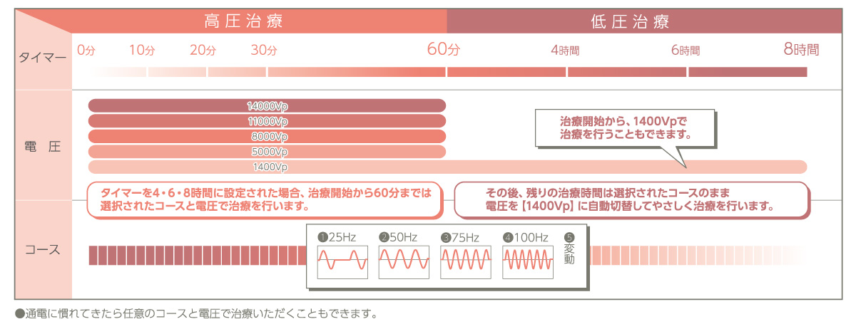 1400Vp出力で、ゆっくりおやすみになりながら4時間・6時間・8時間の長時間治療が可能です。高圧出力で治療を開始しても、60分後には自動的に1400Vp出
